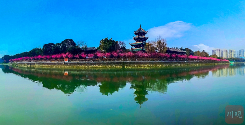 成都望江楼公园,蓝天下锦江沿岸红梅绽放。