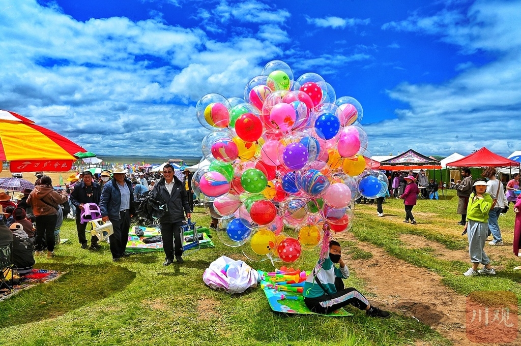 阿坝州若尔盖县游客在草原上尽情享受白云蓝天下的惬意。
