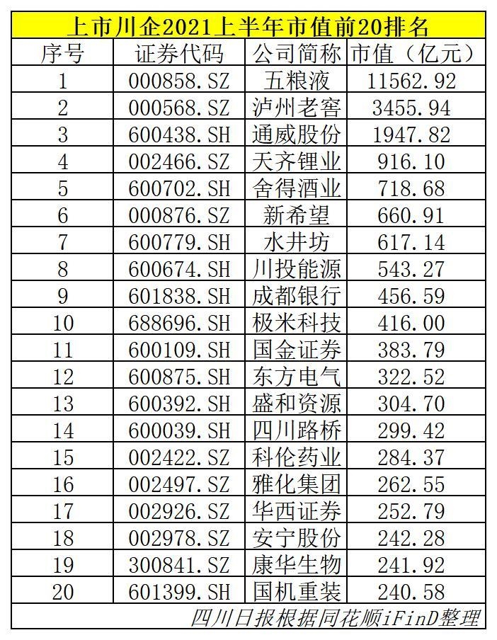 盘点上市川企在资本市场上的表现,今年上半年,上市川企的总市值为32277亿元。其中,市值最高的仍为五粮液,截至6月30日,市值11562亿元;泸州老窖和通威股份的市值也均在千亿以上。