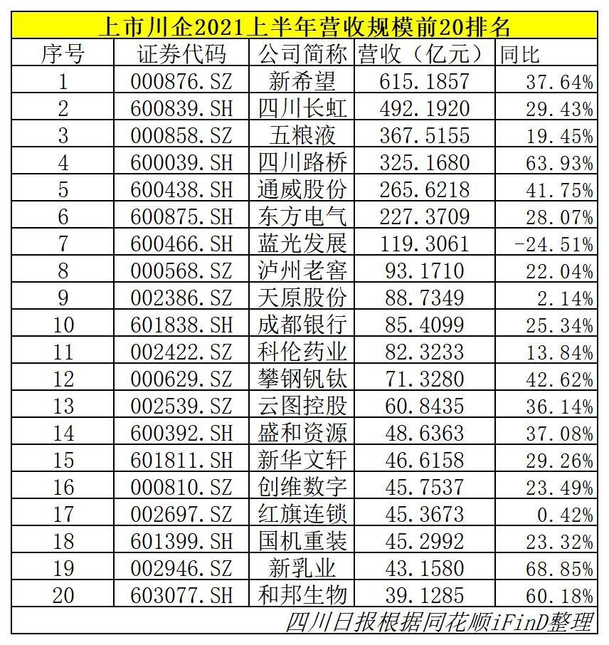 整体来看,上半年145家上市川企中,营收出现负增长的仅有21家,其他124家营收均不同程度增长。今年上半年营收破百亿的与去年同期持平,仍是7家。分别是新希望、四川长虹、五粮液、四川路桥、通威股份和蓝光发展。