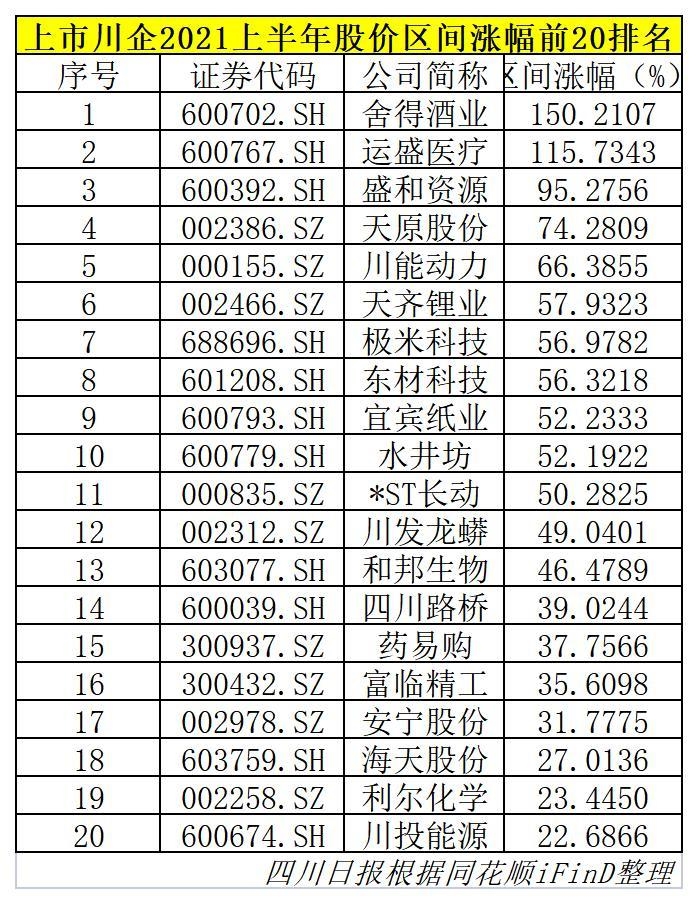 具体来看,舍得酒业以150.21%增长幅度成为上半年股价涨幅最高的个股。今年年初,还未摘帽的ST舍得股价还不足90元,从今年3月开启了飙涨模式,5月摘帽后,股价势如破竹,快速涨破200元关口,6月初甚至一度站上250元。