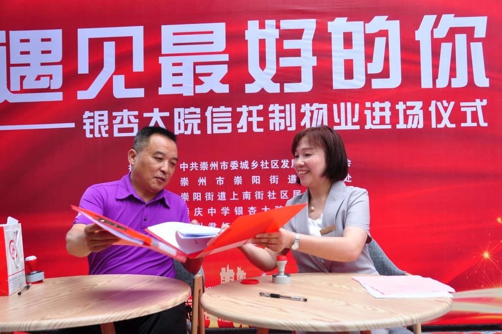 四川在线消息(方楠)9月1日,崇州市首个信托制物业服务小区在崇阳街道上南街社区银杏大院落户,崇州市委社治委常务副主任伍建光,崇阳街道、上南街社区相关负责人和物业代表、小区业主代表、业委会代表参加了物业入驻仪式。
