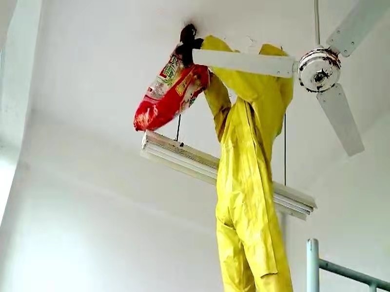随后,一名队员穿戴好防蜂服后,进入房间后紧闭门窗,禁止无防护装备人员进入现场,随即拿出杀虫剂对马蜂进行消灭,并对蜂窝进行铲除喷洒药剂,防止马蜂再次筑巢,铲除完后对现场消灭后的马蜂进行清理,防止还有活的马蜂伤害师生,确认安全后,再次对房间进行喷药并关闭房间,告知学校老师近段时间不要进入房间,如果发现其他地方有马蜂窝或者困难及时告诉我们,千万不要轻易摘除,避免被蜇伤,我们会第一时间到学校帮助解决。