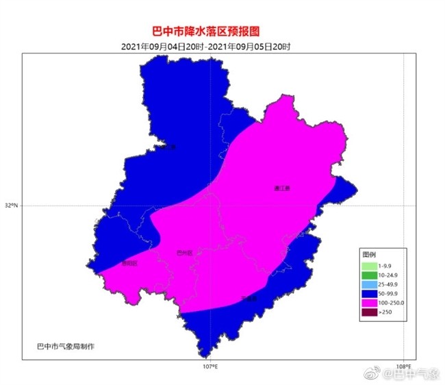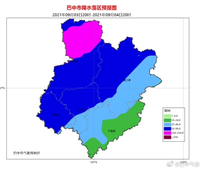 巴中市气象台3日16时发布暴雨蓝色预警:据最新气象资料分析,预计3日夜间至4日白天南江县暴雨,局部大暴雨,巴州区、恩阳区、通江县大到暴雨,平昌县中到大雨。累计雨量40~80mm,局部100mm以上,过程中易出现雷电、阵性大风、短时强降水等强对流天气。前期降雨时间长,累计雨量大,土壤接近饱和,地质灾害气象风险等级高。请注意防范强降雨可能引发的城市内涝、局地山洪、中小河流洪水和地质灾害。
