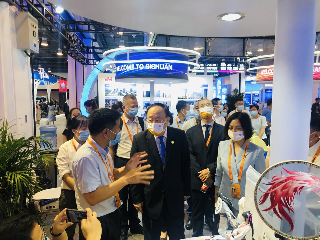 四川馆展览面积100平方米,集中展示了四川服务贸易发展成效、亮点,特别是重点展示了国家数字、文化和中医药服务出口基地建设情况,以及特色优势服务贸易企业风采等,展出内容涉及信息技术、大数据、机械制造、文化、中医药、大健康、其它商业服务等领域。为增强互动性,还特别设置了新冠病毒防控虚拟体验、灾害救援虚拟体验等。