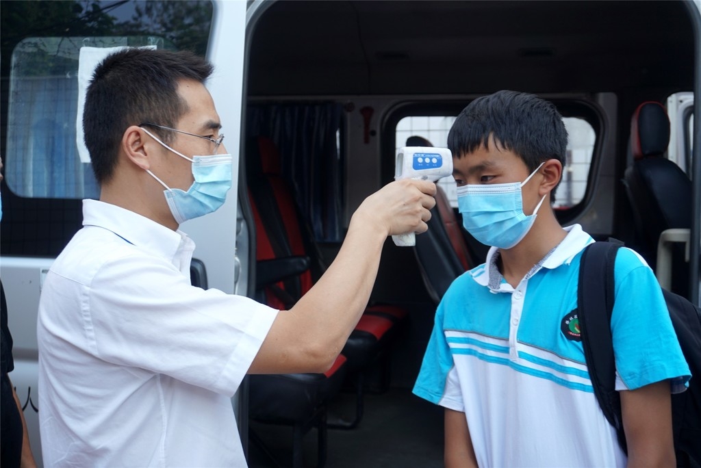 十多分钟后,几名身背书包、手提行李箱的学生在生活老师的带领下,向车辆走来。“大家排好队,戴好口罩,测完体温后就可以上车了。”攀枝花市客运中心客运管理部工作人员严帅手拿测温枪早早地等在车门旁,一边和学校老师引导学生排队上车,一边挨个给学生测体温,见有的学生没有佩戴口罩,严帅从兜里掏出几个新口罩递过去。