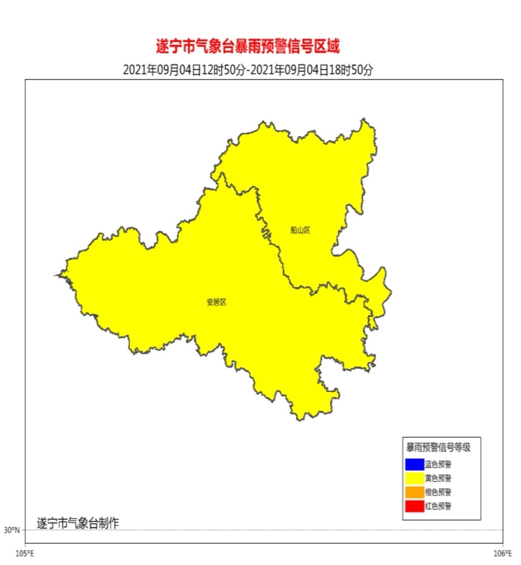 9月4日12时50分,遂宁市气象台发布第41号暴雨黄色预警信号: