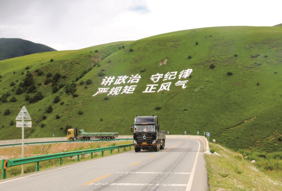 通往德格县的317国道上,“讲政治、守纪律、严规矩、正风气”大地景观映入眼帘。德格县纪委监委供图