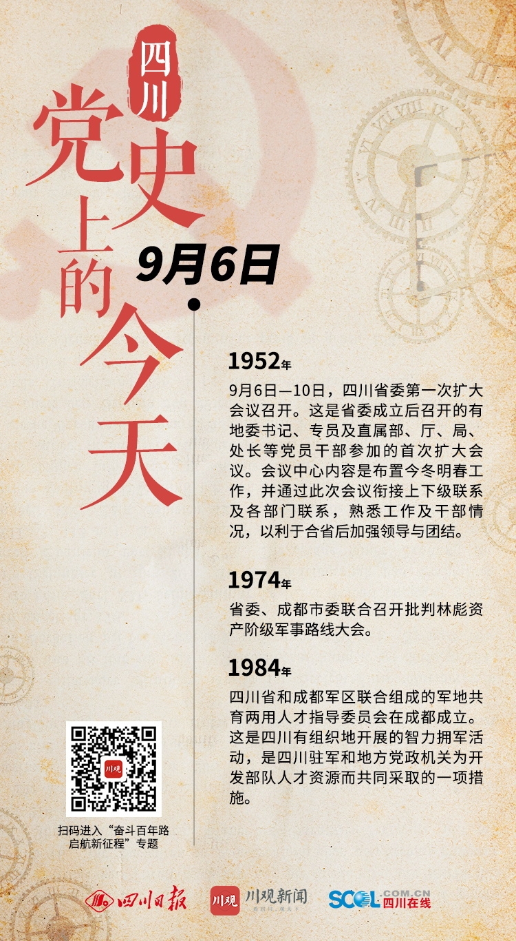 1952年 9月6日—10日,四川省委第一次扩大会议召开。这是省委成立后召开的有地委书记、专员及直属部、厅、局、处长等党员干部参加的首次扩大会议。会议中心内容是布置今冬明春工作,并通过此次会议衔接上下级联系及各部门联系,熟悉工作及干部情况,以利于合省后加强领导与团结。