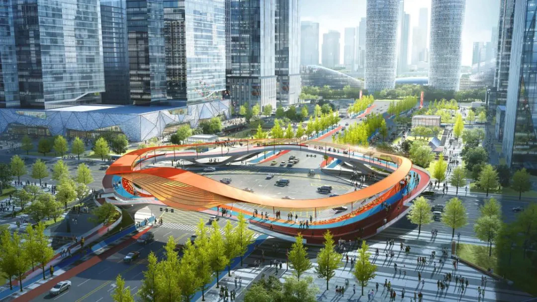在城市设计学中,建筑物与视点的距离(D)与建筑高度(H)之比D/H=2、视角为27°时,则可以整体地看到建筑物,被认为是观察建筑物整体的最佳视角,“因此,我们想到了在此处创建一个能够多维度观赏交子双塔的都市文化地标、交子环。”交子环启用后,形成了一个圆形的空中连廊,观赏品质提升、商圈价值也飞升,赢得了多重效应。