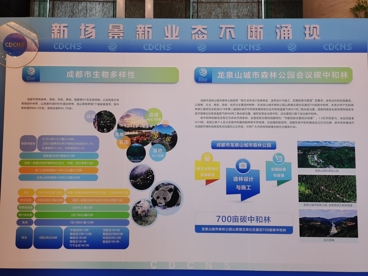 其实,这并非四川首次推行会议碳中和。在本次论坛会场外的一块展板上,展示了龙泉山城市森林公园会议碳中和林的成果。成都市龙泉山城市森林公园按照“碳方法学设计及碳核定、造林设计与施工、后期抚育与管理”的要求,由专业机构实施建造,以香樟、女贞、银杏、栾树、桂花为主要造林树种,在龙泉山城市森林公园山泉镇古驿社区建设700亩碳中和林,未来20年产生的森林碳汇量将完全抵消2018年第二届国际城市可持续发展高层论坛共排放温室气体921吨二氧化碳当量,国家网络安全宣传周网络安全技术高峰论坛排放温室气体466吨二氧化碳当量,最终实现会议碳中和,这也是四川首个会议碳中和林。