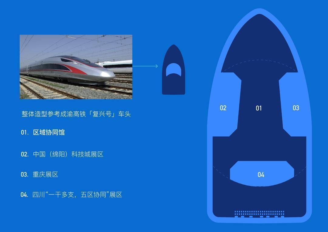区域协同馆的造型上采用了我国具有自主知识产权的复兴号动车组,强调成渝绵协同发展这一主题,寓意着成渝绵协同发展在构建经济第四极中起到的支柱性作用,也寓意着会不断向外辐射带动更多地区实现区域协同发展。