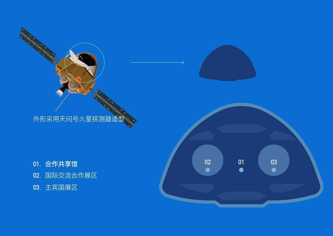 合作共享馆外形则采用天问一号火星探测器外形。天问一号探测器着陆火星,是对中国火星探测技术综合能力的一次巨大考验,为下一步实现火星采样返回打下了重要基础。整个场馆的设计以两个盘旋上升的光柱以及两块展板为主要视觉,象征着在构建人类命运共同体的时代背景下,国内外科技领域的紧密合作,在合作中共赢,在合作中不断进步。