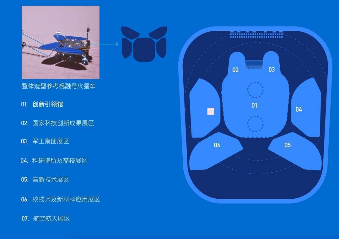 在创新引领馆的造型上,采用祝融号火星车作为基础造型。我国作在首次探测任务中就实施火星车探测,这代表着我国在航空航天领域的巨大进步。通过祝融号作为基础造型,突出创新引领这一主题。