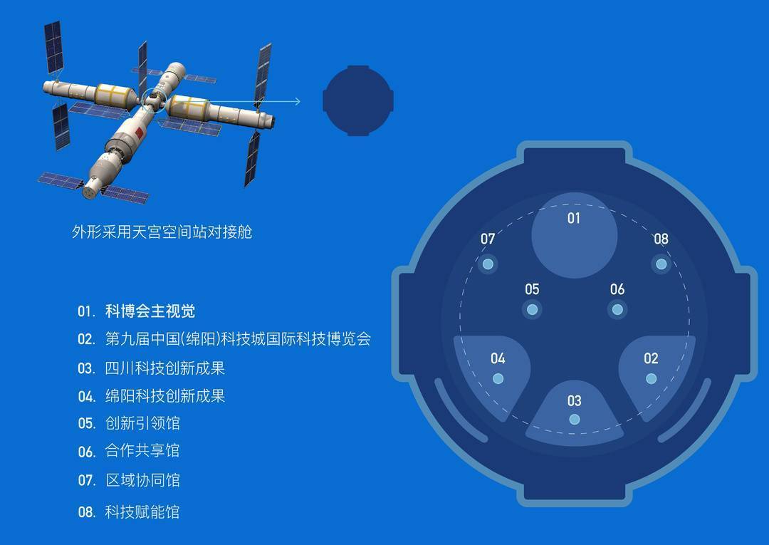 序厅造型上采用了天宫空间站对接舱作为基础造型展开设计。突出序厅的链接作用,同时突出展示我国在空间技术上的重大突破。序厅将分为第九届中国(绵阳)国际科技博览会、四川科技创新成果、绵阳科技创新成果三个板块,四个展馆的入口则分别以传送门的方式展现。