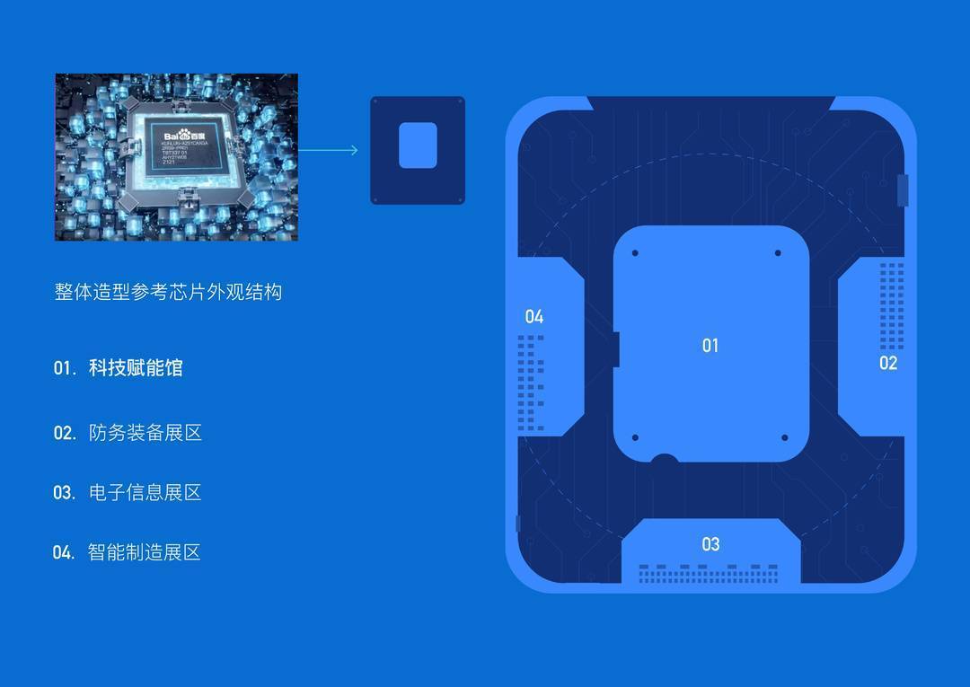 科技赋能馆在整体造型上采用芯片作为基础造型。突出我国近年来在芯片等高端制造业的持续发力,通过芯片这一设计元素突出科技赋能这一主题。该馆的中央智能机器人代表着人工智能技术不断赋能我国产业升级,顶部的科博会会徽象征着科博会在这一过程中起到的先驱作用。在场馆内部的整体设计上强调信息化智能化元素,突出科技赋能这一主题。