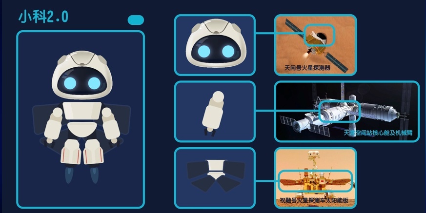 据了解,“小科”2.0在整体造型上延续之前的外形方向,新版在头部采用了天问号火星探测器的着陆舱;手臂上釆用的是天宫空间站的核心舱和机械臂的造型;在背部采用的是祝融号火星车的太阳能板。