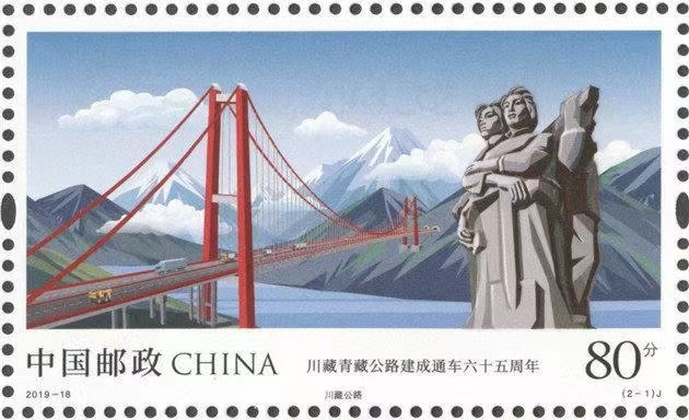 第三枚邮票和川藏高速公路有关。2018年底,雅康高速公路全线建成通车,这是第一条由四川盆地向青藏高原爬升的高速公路,被业内誉为“攀登公路建造史的珠穆朗玛峰”,泸定大渡河大桥是全线代表性工程之一,有“川藏第一桥”之称。大桥主跨1100米,是一座建造在高海拔、高地震烈度区、复杂风场环境下的钢桁梁悬索桥。2019年,《川藏青藏公路建成通车六十五周年》纪念邮票发行,该桥被选中,作为其中一枚的图案。邮票上,通体红色的大桥旁,是面带坚毅的养护工人雕塑。