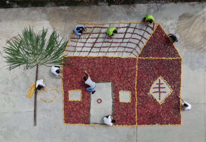 在德阳市旌阳区柏隆镇隆兴桥村百香果种植基地,当地近20余位村民和果农轮番上阵,将采摘的1000余斤百香果、300多斤玉米,摆放成带有“丰”字的美丽新居,庆祝丰收。 资料图片 肖雨杨 摄