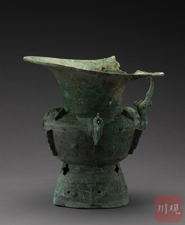 在8号坑西侧,另一件觚形尊同样是不可多得的精美青铜器。这件觚形尊高约70厘米,在全国范围内也不多见。它的口沿和尊体装饰了一圈乳丁,表面有繁复纹饰,上涂朱砂。赵昊表示,这件觚形尊和三星堆出土的典型铜尊大口尊相比,明显做工更加精细,“这意味着它可能是三星堆人找中原定制的一种产品,也由此说明三星堆和中原的交流中,不仅只交换器物,还交换了知识和需求。”