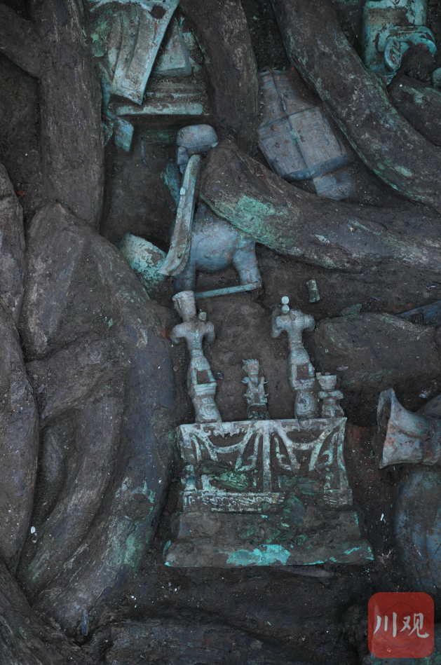 造型繁复的神坛,被考古人员认为可能表现了三星堆举行祭祀的一个场景。在3000多年前的庄严祭祀中,有人扛祭品,有人双手持握进行某着仪式,有人会跳着祭祀的舞蹈……“它的造型体现了一种天马行空的想象力,并且铸造精美,完全称得上是三星堆又一件国宝级文物!”赵昊介绍,由于青铜神坛目前还没完全清理出来,仅发现了神坛之上的5个小人,“但如果它是正方体,神坛上应该有12个人物,他们分别对应了三星堆参与祭祀的不同角色。”