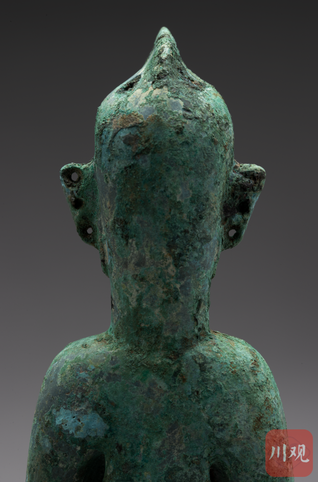 同样在3号坑,另一件青铜人头像则神似三国时期“诸葛亮”的造型。这件器物是在提取坑内的青铜大面具时发现的,虽然是青铜人像,却和1986年出土的青铜人头像完全不同。他的头发往后卷曲梳成瓦片的夸张形态,就像诸葛亮所戴冠帽。这件青铜人头像脑后还有青铜构件连接,应是其它器物上的一个组成部分。