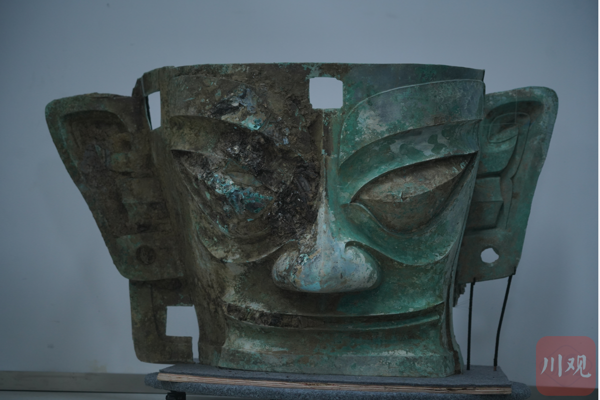 9月9日,三星堆祭祀区公布最新阶段考古成果。记者获悉,3号坑此前提取的青铜面具,为三星堆迄今为止发现的最大青铜面具,比三星堆博物馆目前陈列的青铜纵目面具和大面具还要大。