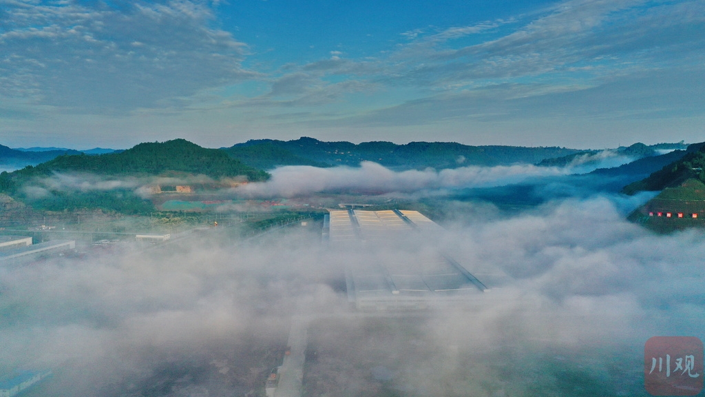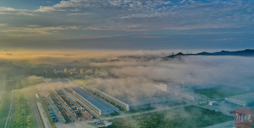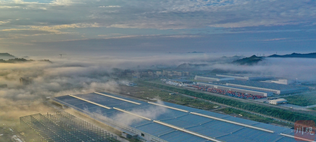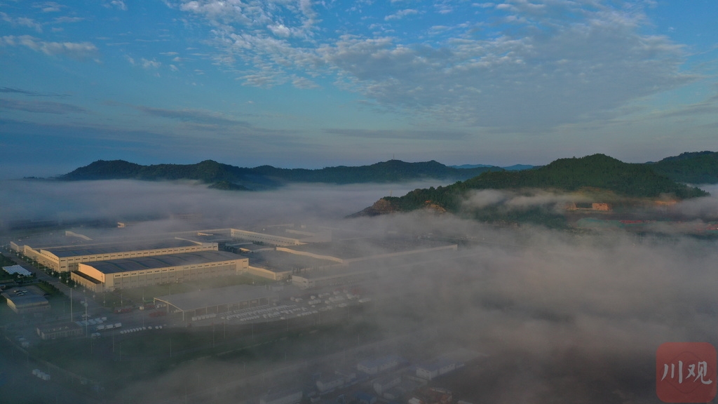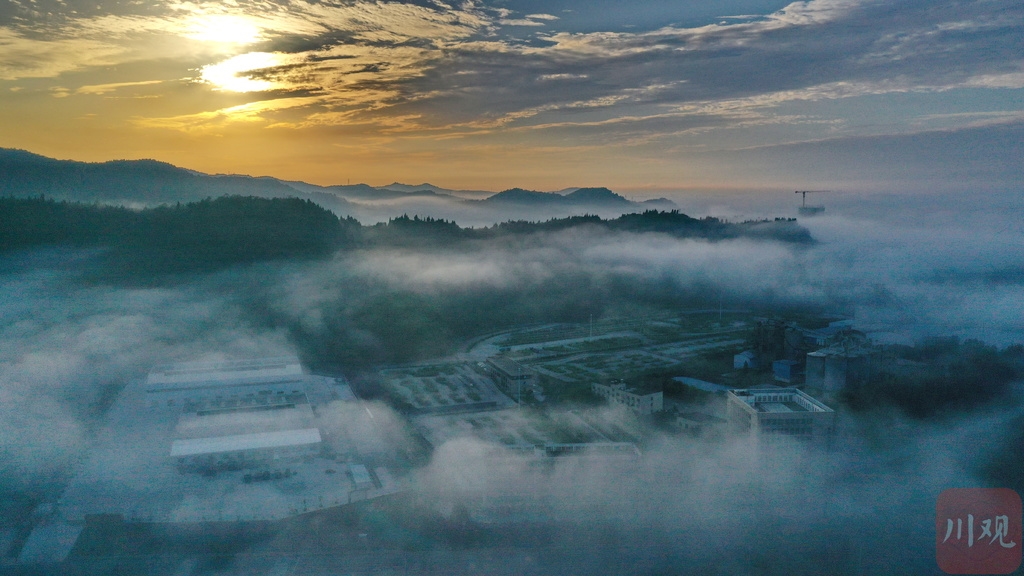 9月9日上午,四川省南充市嘉陵区嘉陵工业集中区上空云雾缭绕,随着红日东升,灿烂的阳光透过早雾,一缕缕地洒满了整个工业集中区,气势恢宏的厂房、纵横交错的道路、郁郁葱葱的山林时隐时现,呈现出一幅幅纯美的水墨画卷,宛如人间仙境。