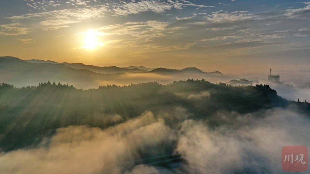 位于南充市嘉陵区的嘉陵工业集中区上空,太阳徐徐升起,云雾缭绕,美轮美奂。