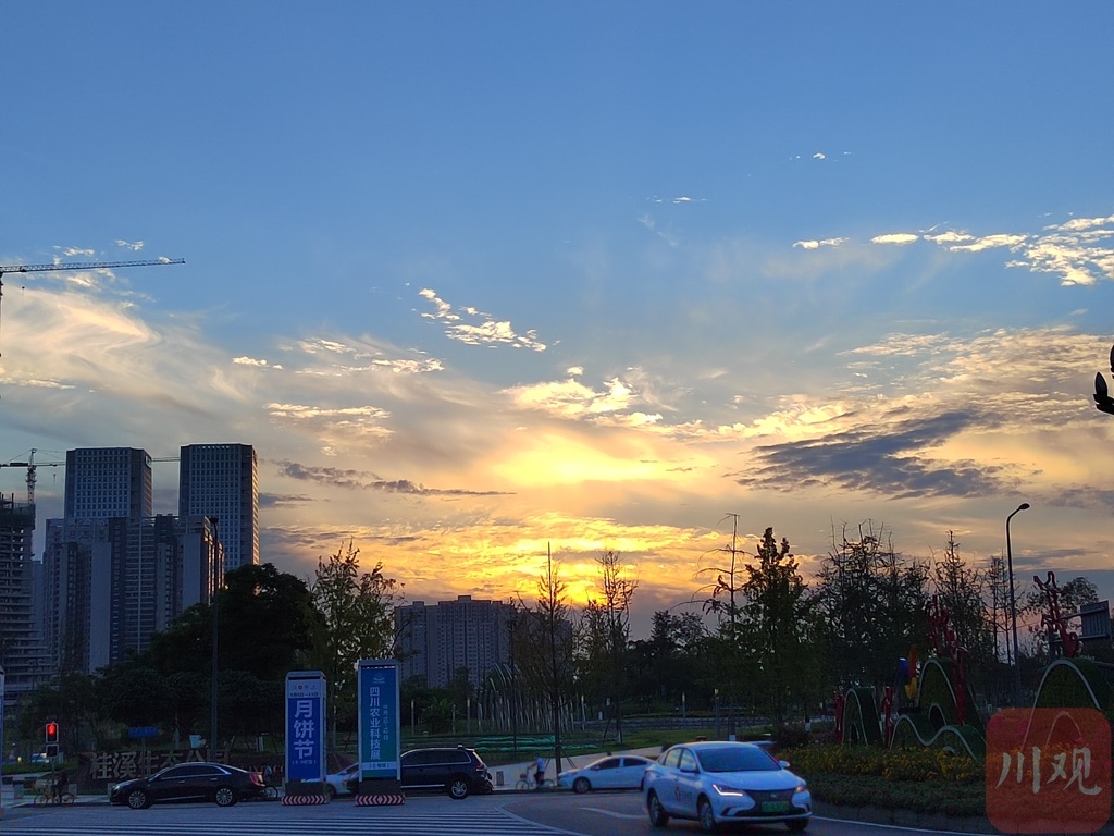 9月9日傍晚,成都市再现绝美火烧云美景。当天空气通透,西边云彩在落日照射下散发出红艳光芒,不少市民下班路上拿出手机驻足拍照。