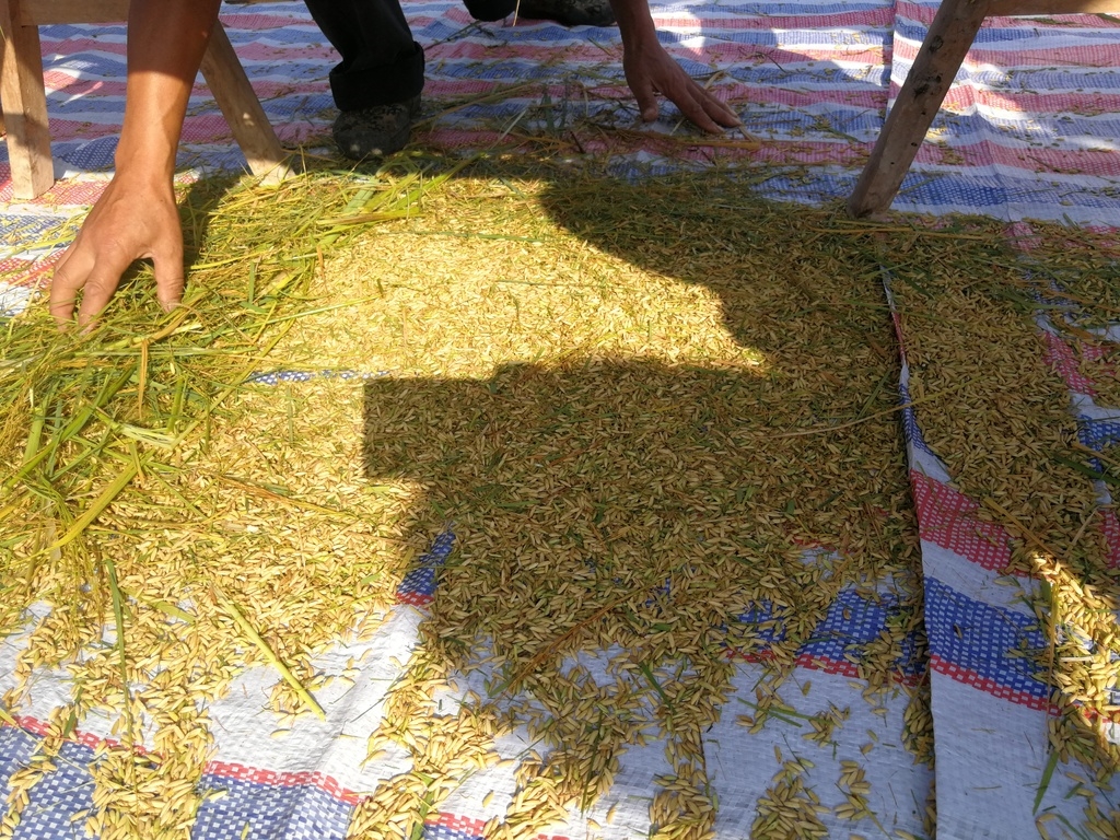 “又来称谷子了嗦?”一旁看热闹的村民把锄头杵在地上,笑嘻嘻地,见怪不怪。