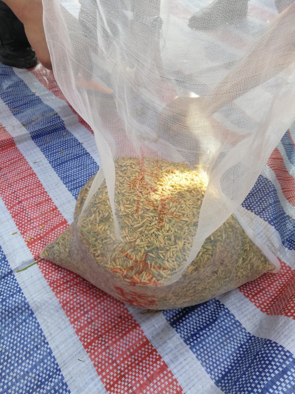 “看下鞋子缝缝里还有没有?塑料布边边再抖一下。”对筛到地上的空谷子,调查人员每一颗都去捏了捏。