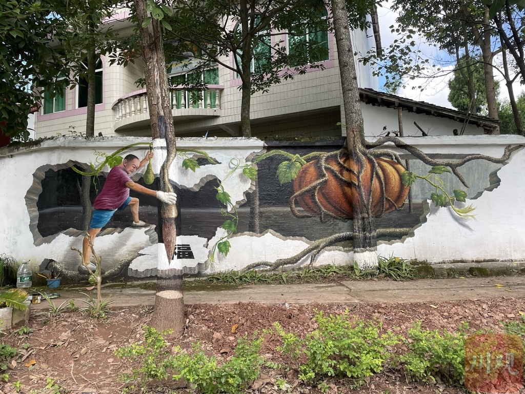 这是画师羌石佳月为斗笠村画的第一幅3D立体画,他曾以3D立体隐身画火爆抖音等社交平台。8月,他受邀来到斗笠村,对农房进行外立面设计、庭院围墙美化等。羌石佳月结合村里自然环境,并加入当地特色元素巧妙设计,鲜艳的色彩、丰富的层次、逼真的效果,围墙瞬间“活”了起来。“第一次受邀到村里来作画,希望能用画笔,让单调的白墙变为乡村的靓丽风景线。”羌石佳月说。
