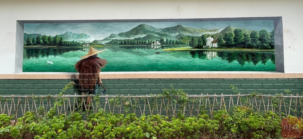 9月10日,走进遂宁市大英县斗笠村口,迎接记者的是一幅栩栩如生的壁画,上面画着山秀水明的斗笠村风光,从远处看画前似乎站着一位头戴斗笠、身穿蓑衣的农户,走近一看,原来是画中人。别致的壁画,也吸引着前来村里农家乐游玩的游客拍照留念。