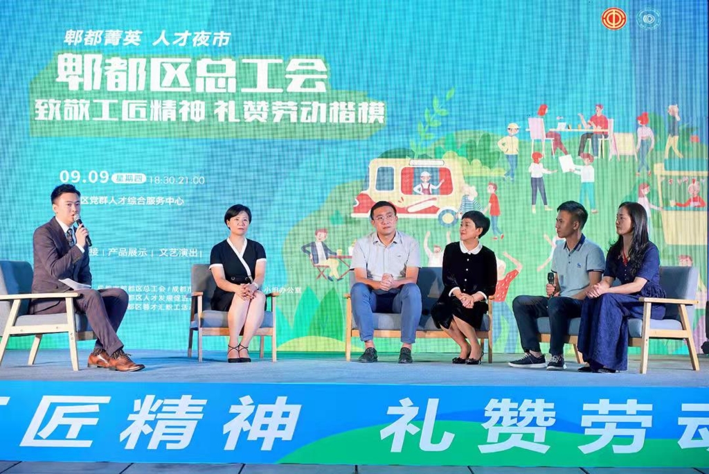 为充分发挥工匠劳模的精神引领作用,献礼广大劳模工匠,9月9日晚,由成都市郫都区总工会联合郫都区人才办主办的“致敬工匠精神,礼赞劳动楷模”暨2021“郫都菁英”人才夜市活动在郫都区党群人才综合服务中心举行。“致敬工匠精神,礼赞劳动楷模”主题分享会上,劳模工匠讲述自己的逐梦故事,诠释工匠精神。