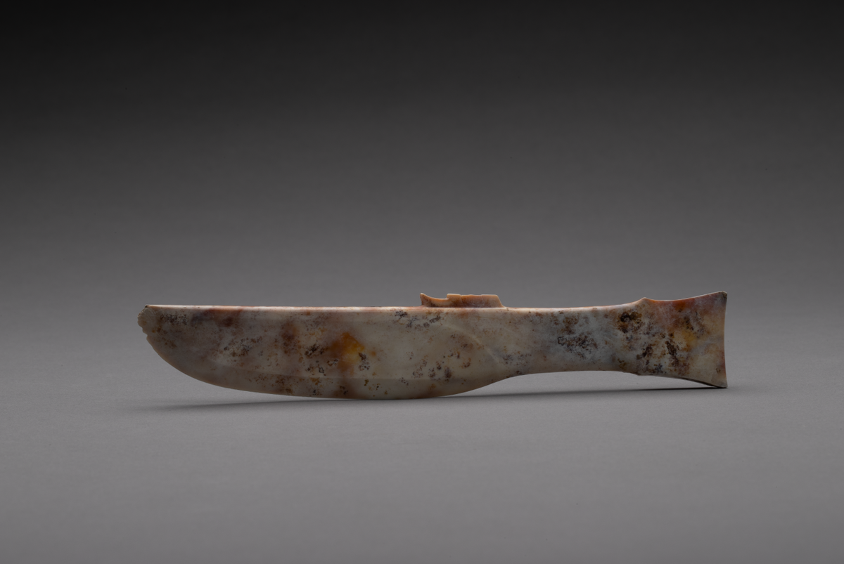 据介绍,这把玉刀发现时在6号坑木匣子底部破损处的外侧,玉刀长22厘米,宽3.4厘米,刃部厚160微米。其形制和大小,与如今常见的西餐刀十分相似,在刀背处还有一个小小的类似鱼背鳍一样的装饰,在三星堆玉器中堪称精品。同时期来看,这是一个全新的器型,此前殷墟遗址等也有玉刀出土,但是这样的形制却从来没有见过。