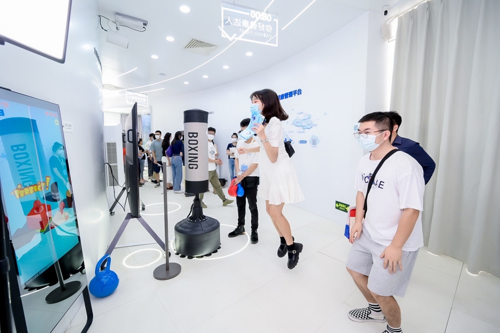 在智慧健康体验区,通过参与传感搏击游戏,参观者可实时在超高清大屏上获取速度、力度等健康数据,同时投影互动墙还全面展示了BOE(京东方)基于个人健康管理、社区卫生服务和数字医院诊疗的全方位全周期健康管理平台。