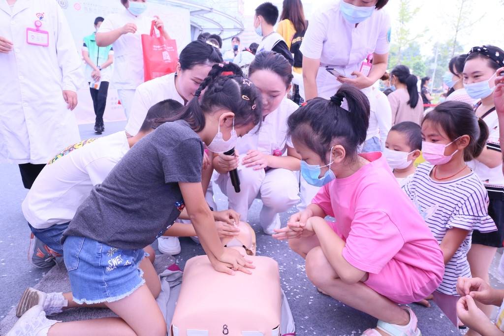 普法只是其中一环。成都市30余名“救在身边”医务志愿者为在场200余名社会公众传播急救知识,采取“线上+线下”的模式,向公众讲解工作生活中意外伤害常见的种类以及预防措施,演示了心肺复苏的方法步骤及外伤应急包扎等技能。