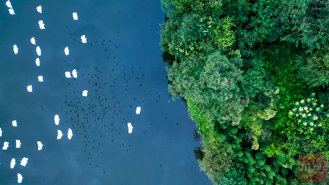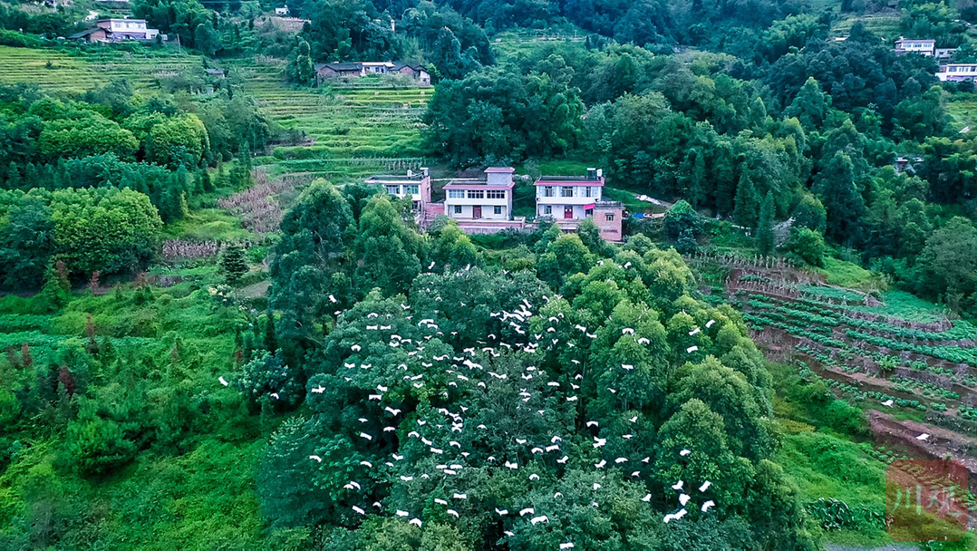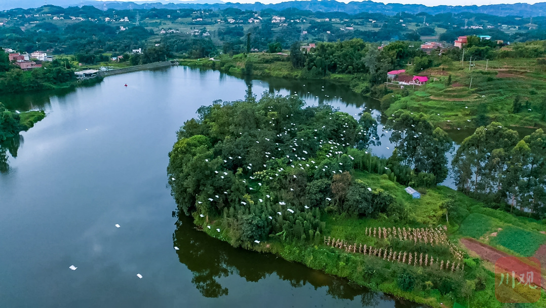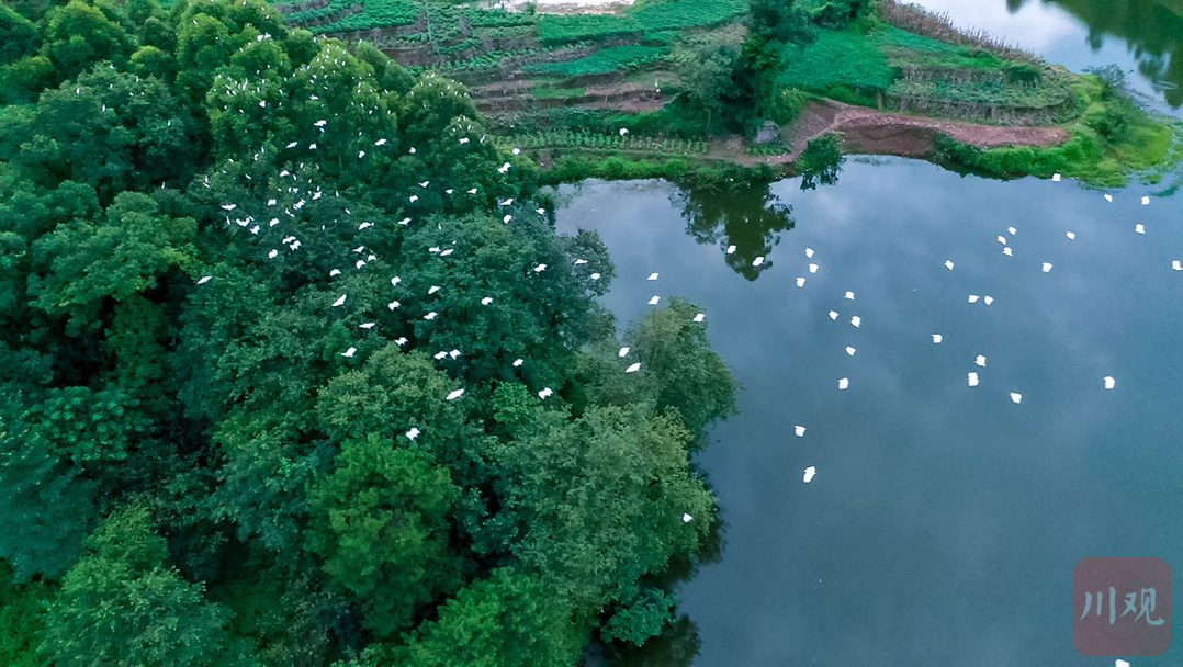在宜宾市叙州区普安冠英乡的一水库区,每当傍晚时分,你就能看到成群结队的白鹭飞过田间地头,归巢于一颗大树上。