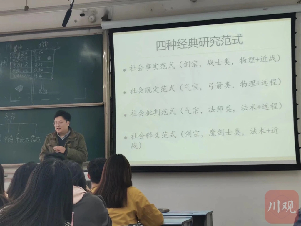 景老师解释,学术研究方法课内容相对艰深,对本科生而言理解难度很大。于是他将已有的四种学术范式分别划归为四种武侠流派,以方便学生理解和记忆,让学生能够很快地融入教学。