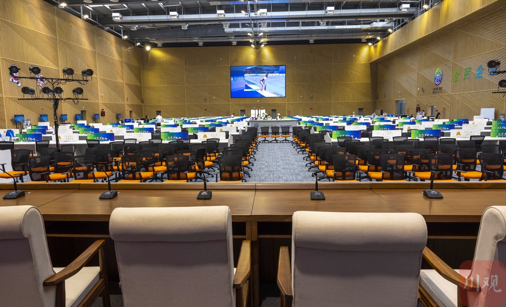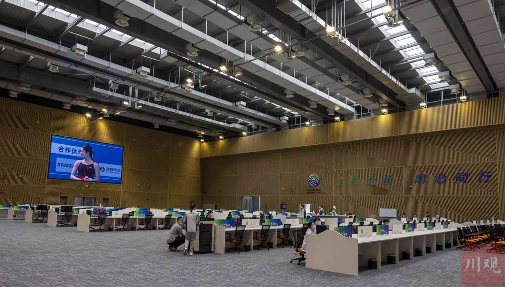 主新闻中心是注册记者的工作总部,最多可同时满足1000名记者开展各项工作。主新闻中心设有新闻发布区、媒体工作区、媒体采访区、记者休息区、会议服务区、中省媒体办公区、摄影器材服务区、医疗防疫区、商业服务区、门厅服务区、转播运行区等十一个功能区域。墙面上挂有与全运会历史相关的照片。