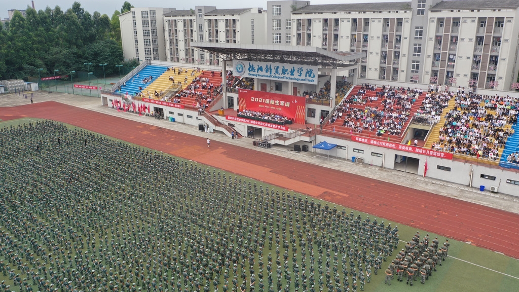 2021年9月13日,德阳科贸职业学院举行2021年军训汇报表演暨新生开学典礼。近4000名新生身着迷彩服,各学院方队在教官的指引下,以饱满的热情、矫健的步伐、嘹亮的口号、整齐划一的动作,器宇轩昂,展示出大学生积极向上的青春姿态。