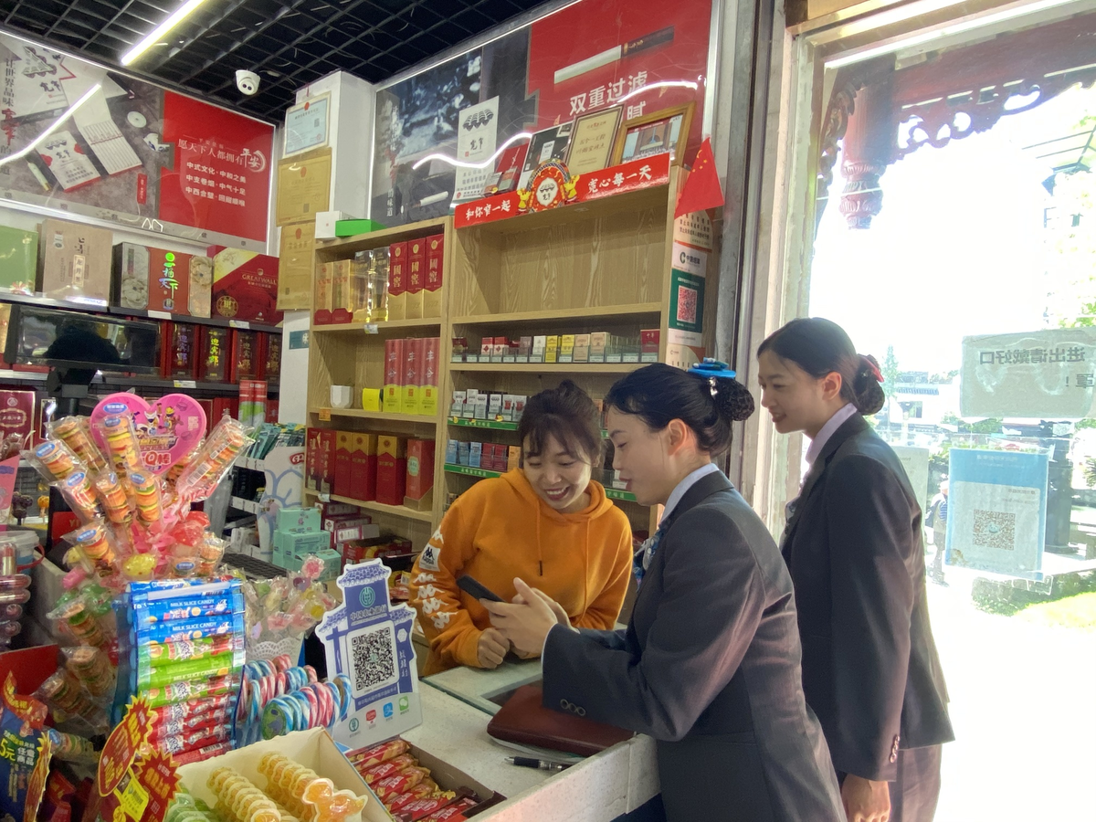 农行成都分行工作人员指导便利店主使用智能设备