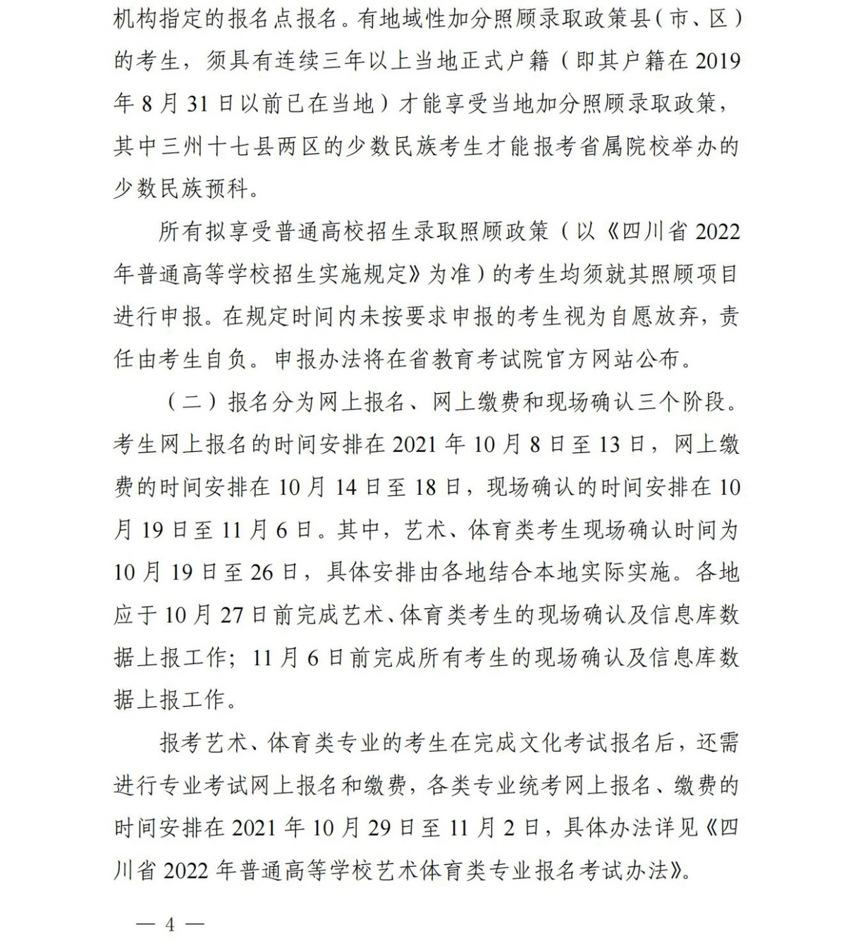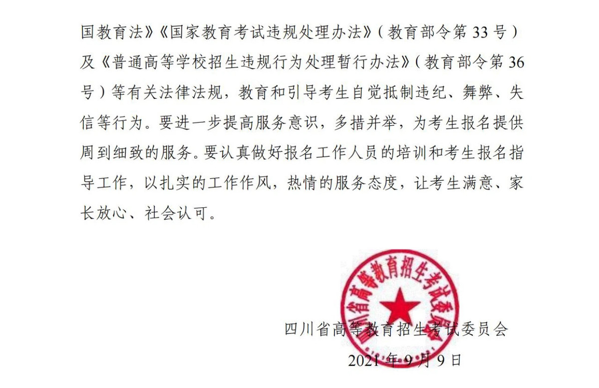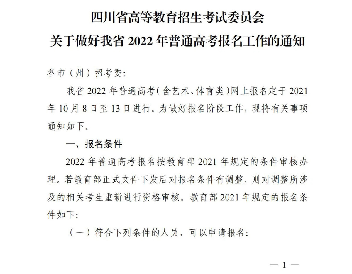 9月14日,四川在线记者从省教育考试院获悉,四川2022年普通高考(含艺术、体育类)网上报名定于10月8日至13日进行,详情如下: