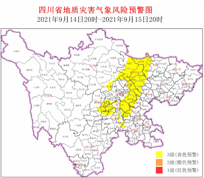9月14日,四川省地质灾害指挥部办公室根据四川省地质环境条件,结合四川省气象台天气预报情况,发布地质灾害气象风险黄色预警:9月14日20时至9月15日20时,黄色预警范围较前一日继续扩大,12市(州)54个县(市、区)拉响黄色警报。
