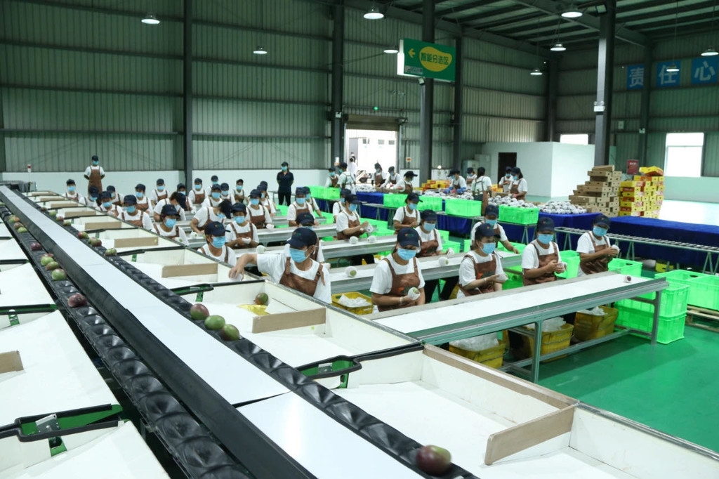 在全国首条芒果灭菌智能分选线上,20多名员工在各环节上有序作业,这有力填补了国内芒果采后标准化处理空白。据钟方祥介绍,分选线日加工能力达50万斤,通过灭菌能够延长果蔬供货期,提高品质,由此提高单价10%以上,也带动当地85%以上的芒果经初加工后外销。