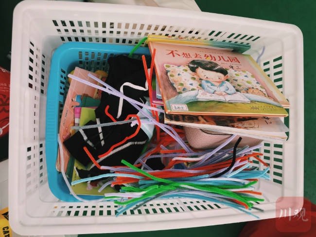 在刘梅身旁,还有一个大箱子,里面装着彩泥、绘本、毛条、积木,都是供孩子们使用的手工用品。