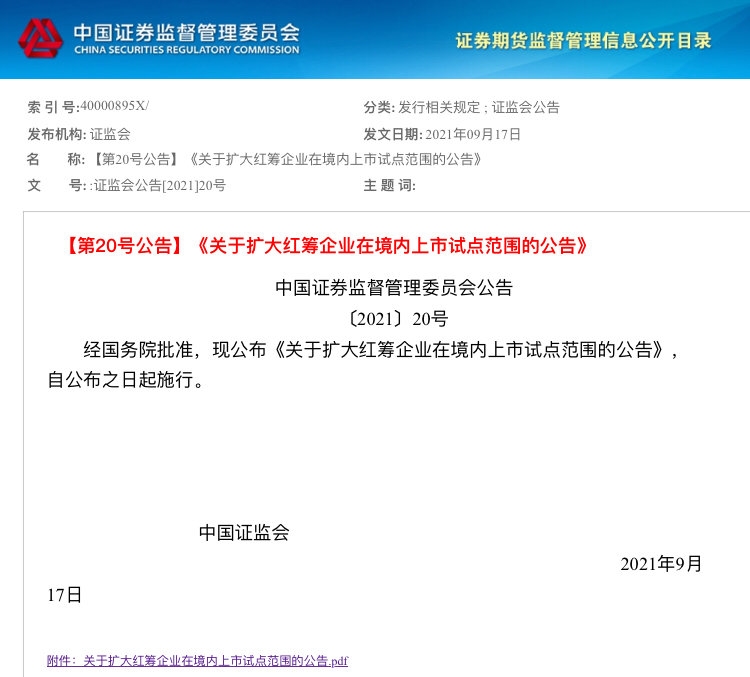 9月17日晚间,证监会发布公告称,将扩大红筹企业在境内上市试点范围。
