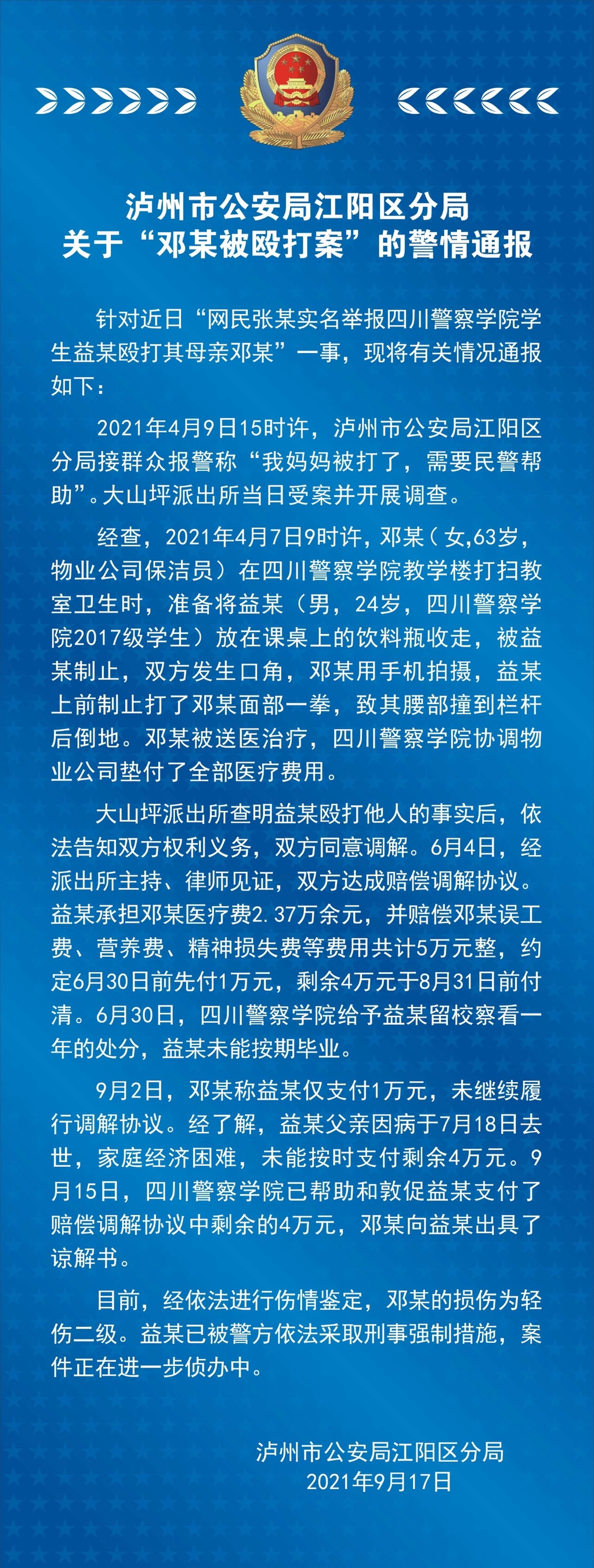 9月17日,泸州市公安局江阳区分局发布关于“邓某被殴打案”的警情通报。