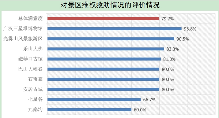 调查结果显示,游客对各景区维权救助情况总体满意度为79.7%。各景区均公布有消费者维权电话,并放置了投诉信箱和意见本,但有的标识不明显或是设置位置不合理。
